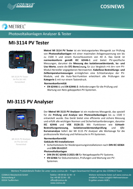 Cosinews - Neue Metrel PV-Prüfgeräte MI3114 & MI3115 für effiziente und sichere Anlagenprüfung 11/24
